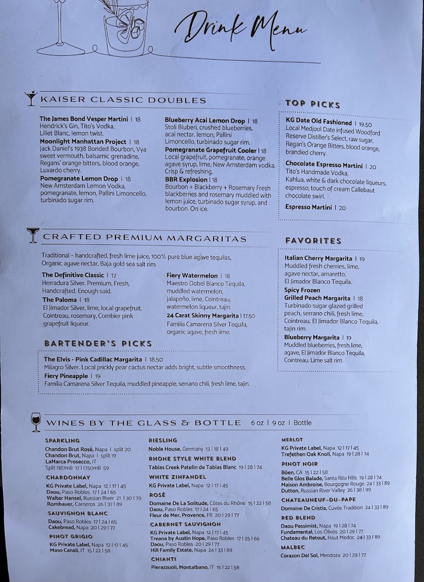 The menu at Kaiser Grille is a celebration of seasonal flavors and culinary craftsmanship. Featuring Italian-inspired cuisine, each dish is thoughtfully prepared to deliver a memorable dining experience. As you peruse the extensive offerings, prepare your palate for a range of delightful options. Recommended for your evening endeavors, the port blend wine list is a stand-out, featuring selections such as the Graham's 20 year Tawny and Quinta Vale D. Maria Reserva Porto, promising a perfect pairing for your meal.