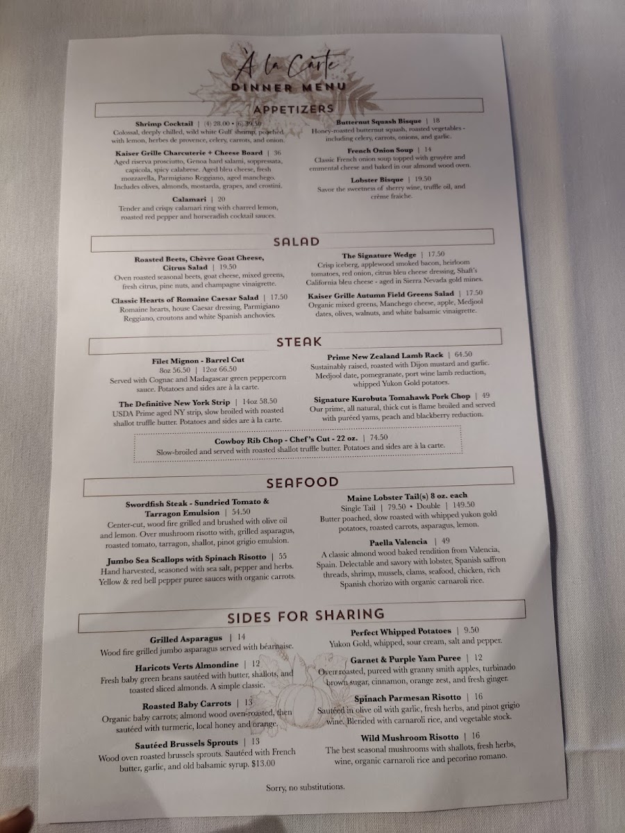 Happened to walk by and checked out the menu. Decided to stop in. Front desk host told us we needed a reservation and they are not taking any at this time. Stepped outside and made a reservation via OpenTable for 3 minutes later! What the heck is that! That was a huge turn-off. The host could have just told us that was an option. We decided to try it out anyway. I am so glad we did! Our server, Cameron, was great! The food was amazing. Porterhouse and filet were made to perfection. The porter house may be the best we have eaten. The mac and cheese side was also flavorful and delicious. We had French onion soup, calamari and the Kaiser Grille salad as our apps. Chicken Fettuccine Alfredo on the kids menu was delicious. Lastly, the chicken breast dish was juicy and flavorful. Highly recommend Kaiser Grille!